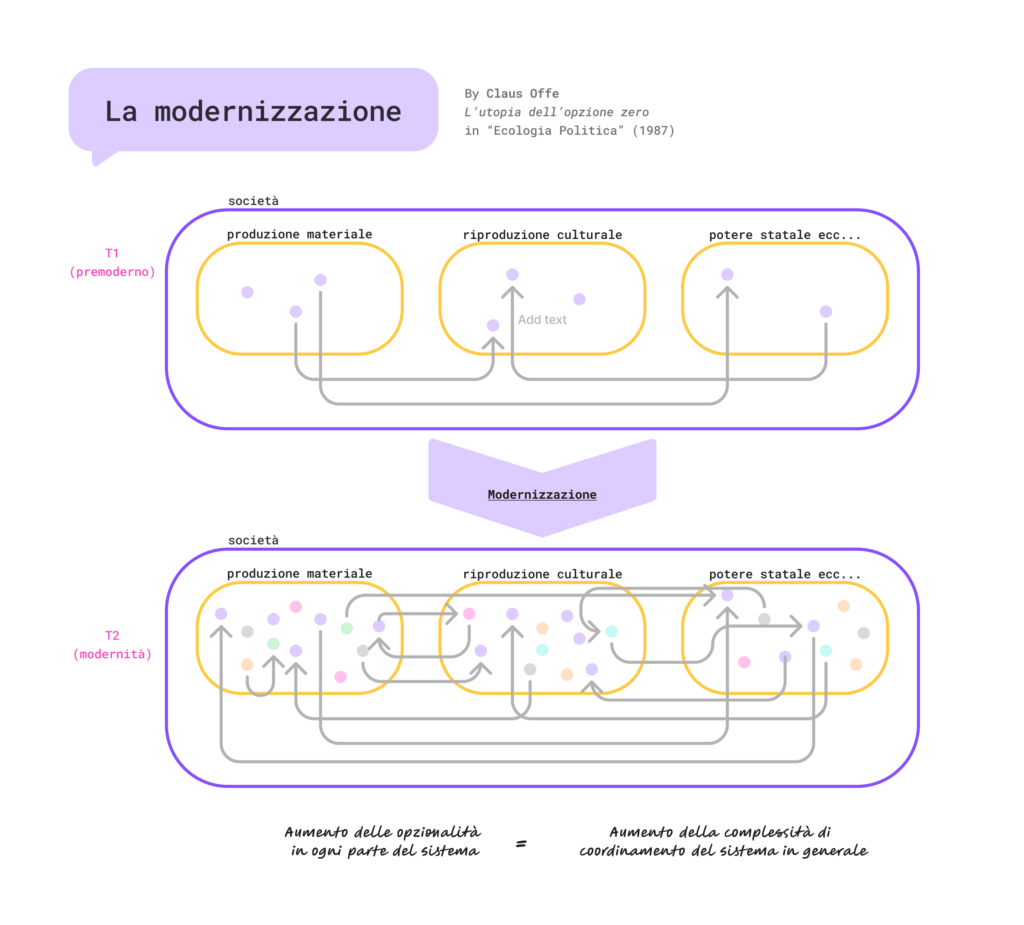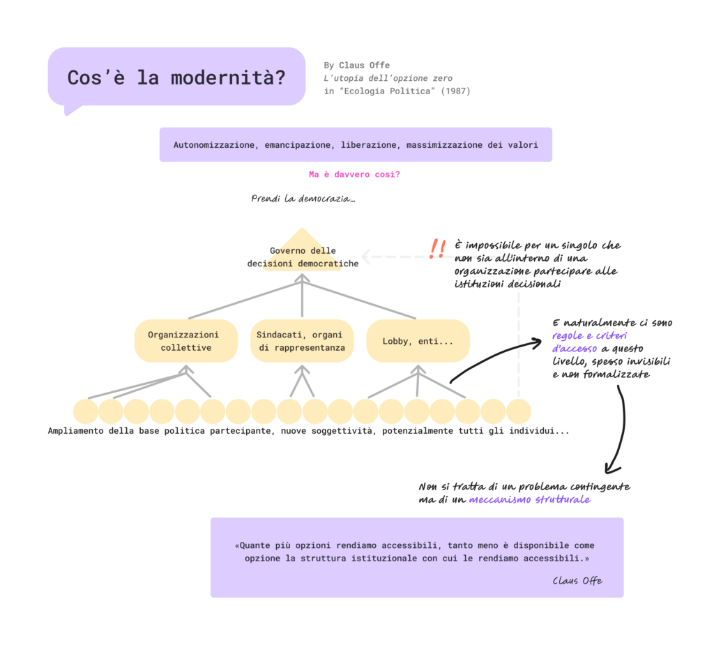 Claus Offe propone una critica strutturale della nostra concezione di modernità, dimostrando come la moltiplicazione delle possibilità di accesso (in potenza) per ciascunə non corrisponde a un’aumento reale delle possibilità di accesso al potere di determinare queste possibilità. Detto altrimenti, tanto la scelta (politica, culturale, di consumo…) si allarga, tanto meno potere il singolo soggetto ha su questa scelta.